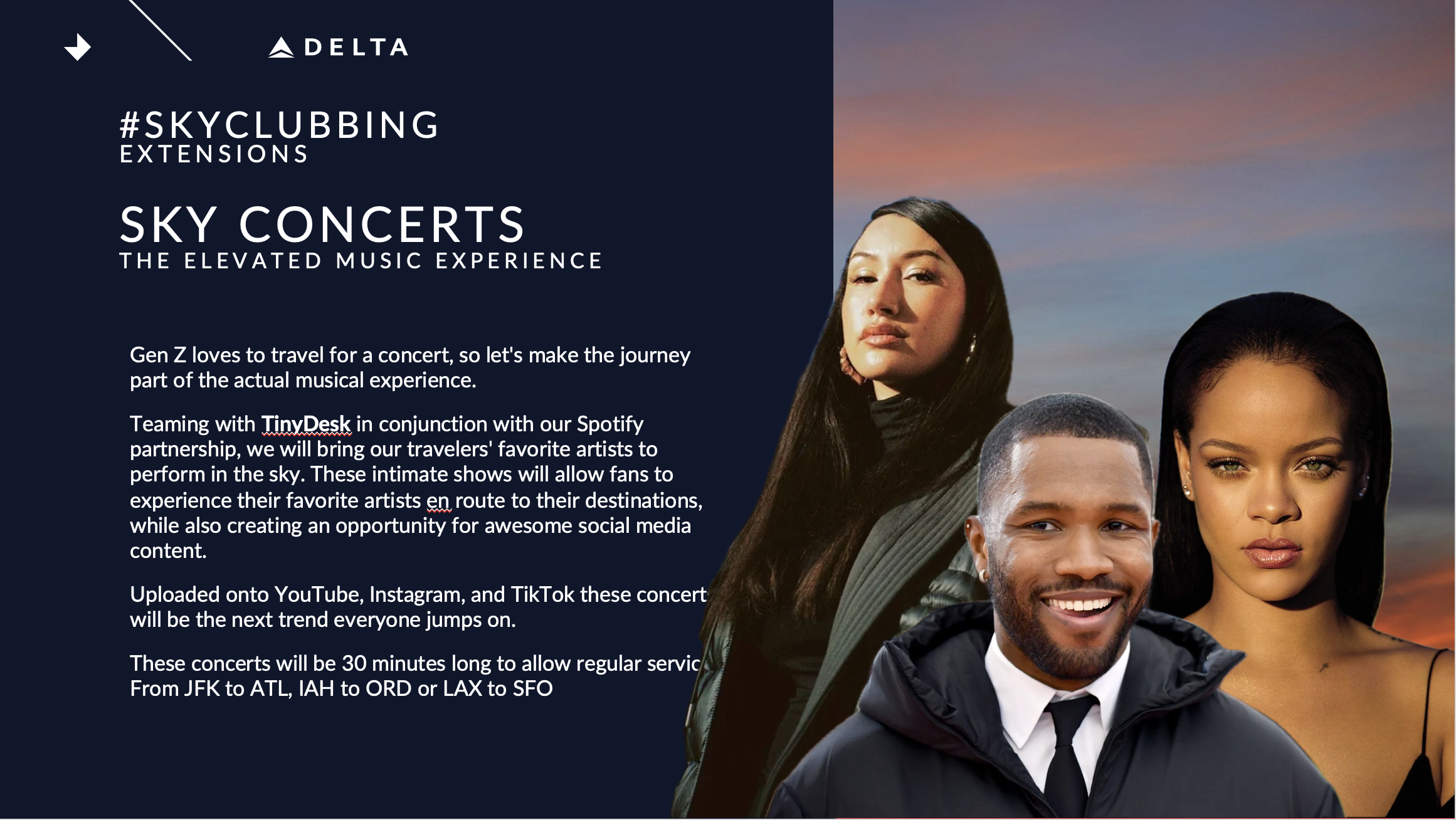 One idea that resonated a lot with the team was around hosting concerts with our favorite artists one a plane. Intimate concerts where Delta Skymiles members could see their favorite artists while in-flight to their favorite travel destinations.